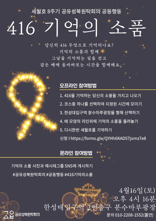 공유성북원탁회의에서 세월호 8주기를 맞아, 공동행동을 진행합니다. 당신의 416은 무엇으로 기억되나요? 기억의 소품과 함께 그날을 기억하는 길을 걷고 같은 배에 올라타보는 시간을 함께해요.