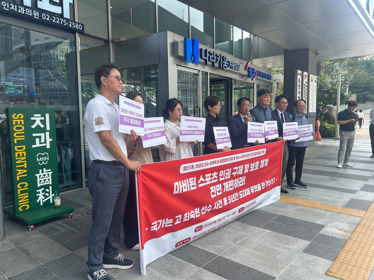 체육시민연대, 문화연대, 스포츠인권연구소, 민주사회를위한변호사모임 문화예술스포츠위원회 등은 국가인권위원회에 이 사건을 진정하고, 국가기관의 관리와 행정 부실로 인한 체육계의 인권침해에 대한 총체적인 개선 권고를 해주실 것을 요청하기 위해, 오는 8월 28일 오전 10시 40분에 국가인권위원회 앞에서 기자회견을 진행하였습니다. |