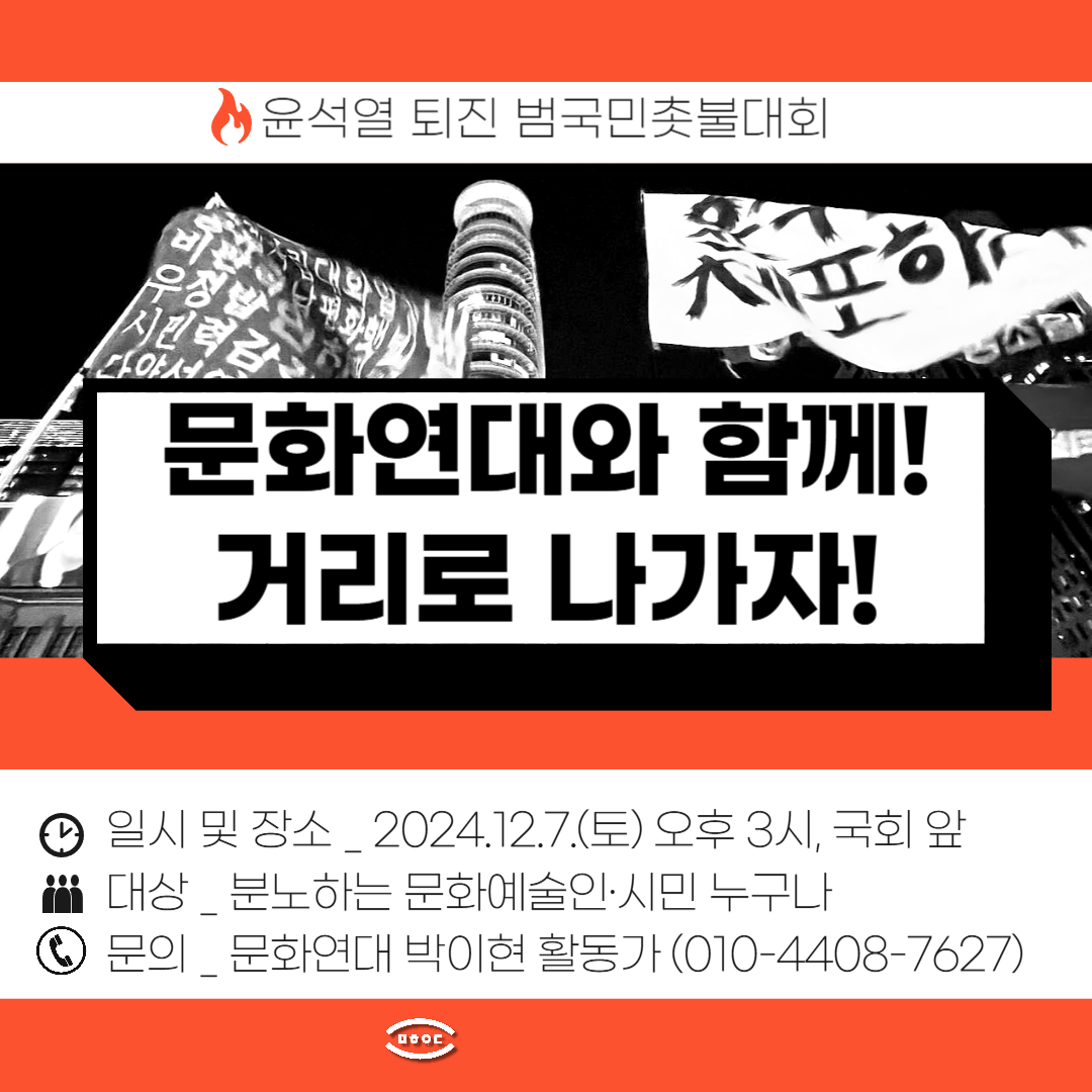 🕒일시 및 장소 _ 2024년 12월 7일(토) 오후 3시, 국회앞(국회의사당역 3번 출구) 🚩문화연대 깃발 아래