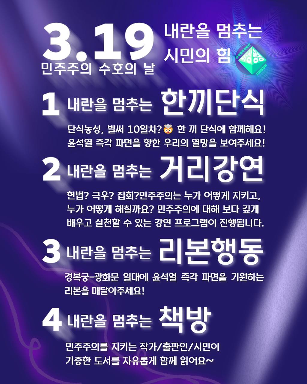 3월 19일, 민주주의를 지키는 시민들이 광장으로 모입니다. 윤석열 즉각 파면을 향한 열망과 분노를 맘껏 풀어주세요! 한끼단식・리본행동・거리강연・책방 등 내란을 멈출 다양한 프로그램이 진행됩니다.