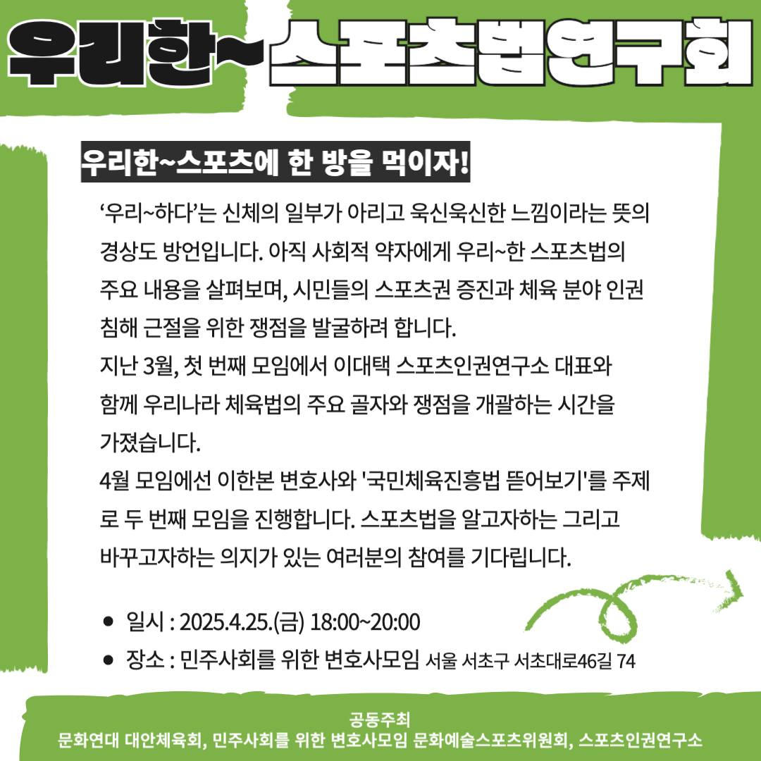 4์ ๋ชจ์์์ ๋ฏผ์ฃผ์ฌํ๋ฅผ ์ํ ๋ณํธ์ฌ๋ชจ์ ๋ฌธํ์์ ์คํฌ์ธ ์์ํ ์ดํ๋ณธ ๋ณํธ์ฌ์ '๊ตญ๋ฏผ์ฒด์ก์งํฅ๋ฒ ๋ฏ์ด๋ณด๊ธฐ'๋ฅผ ์ฃผ์ ๋ก ๋ ๋ฒ์งธ ๋ชจ์์ ์งํํฉ๋๋ค. ์คํฌ์ธ ๋ฒ์ ์๊ณ ์ํ๋ ๊ทธ๋ฆฌ๊ณ ๋ฐ๊พธ๊ณ ์ํ๋ ์์ง๊ฐ ์๋ ์ฌ๋ฌ๋ถ์ ์ฐธ์ฌ๋ฅผ ๊ธฐ๋ค๋ฆฝ๋๋ค.
