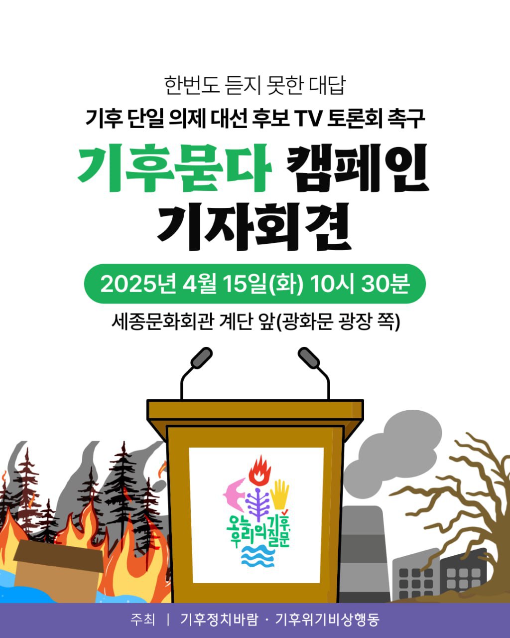 이에 우리 기후위기비상행동, 기후정치바람은 '기후 단일 의제 대선 후보 TV 토론회 개최'를 요구하기 위해 지난 4월 15일, 세종문화회관 계단앞에서 <기후묻다 캠페인> 기자회견을 개최하였습니다.