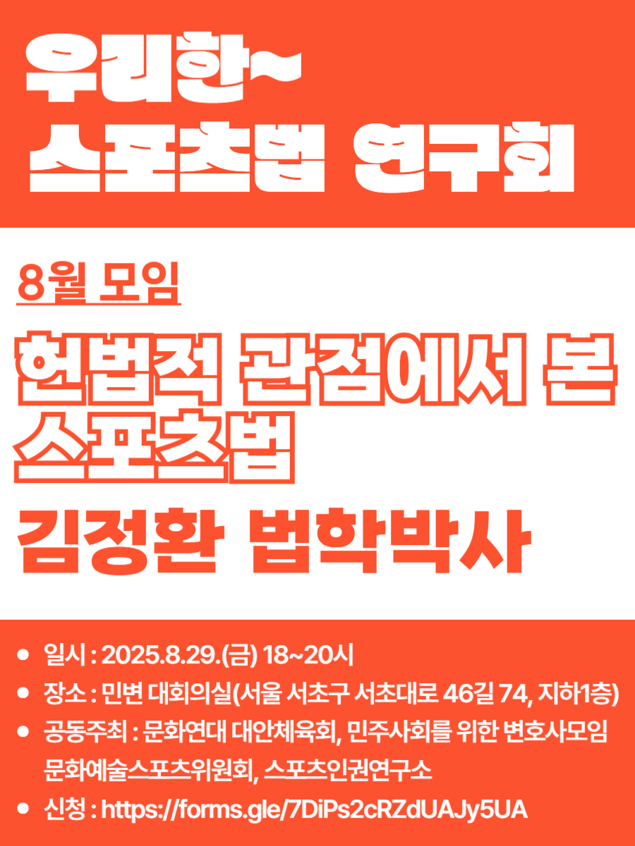 지난 8월 마지막주 금요일 저녁, 스포츠계 교수와 법조인, 체육교사, 시민단체 활동가 등 스포츠 인권에 관심있는 다양한 사람들이 민주화를위한 변호사 모임 사무실 3층 회의실에 모였습니다. <우리~한 스포츠법 연구회>는 우리 스포츠법의 주요 내용을 살펴보며, 시민들의 스포츠권 증진과 체육 분야 인권 침해 근절을 위한 쟁점을 발굴하는 세미나 모임으로, 올해 3월 첫 모임을 시작해 벌써 다섯번째 모임을 가지게 되었어요.