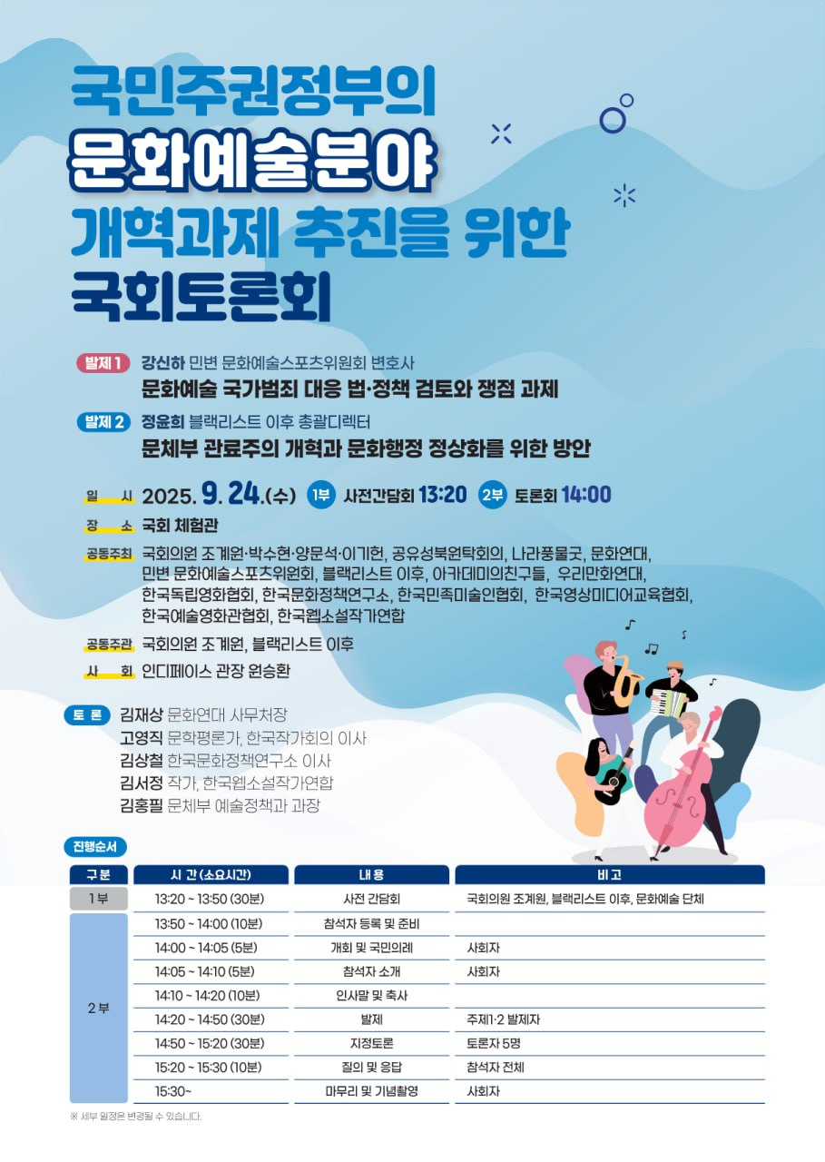 국민주권 정부의 사회대전환을 위한 문화예술분야 개혁 과제 추진을 위하여 윤석열정부 문화예술계 블랙리스트 국가 범죄와 내란 동조에 대한 진상 조사 및 재발 방지와 문체부 개혁에 대한 법‧정책을 토론합니다.
