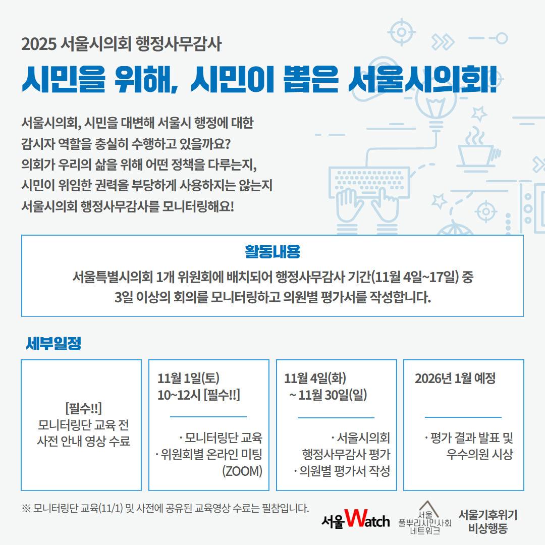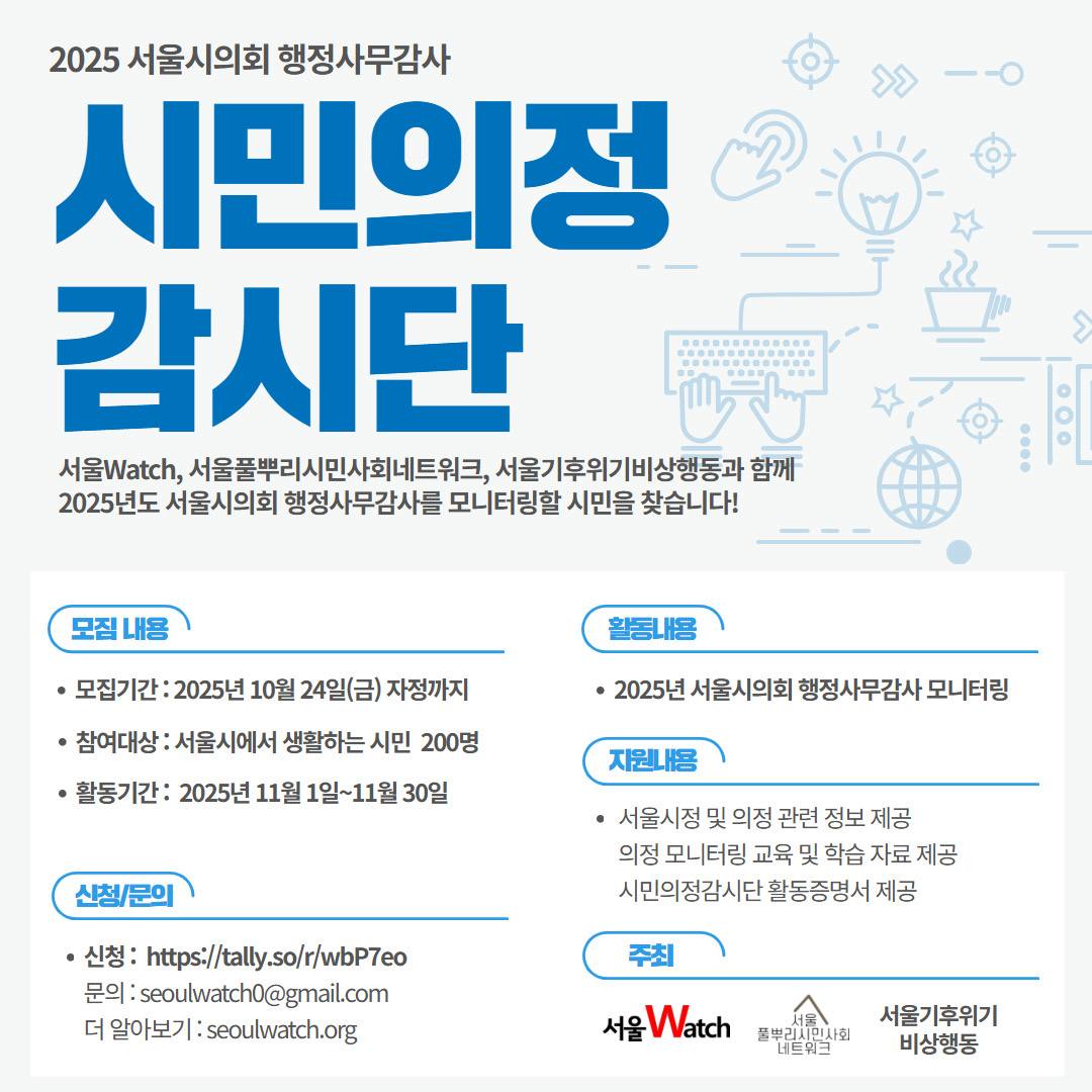 서울Watch, 서울풀뿌리시민사회네트워크, 서울기후위기비상행동에서 2025년 서울시의회 행정사무감사 시민의정감시단을 모집합니다!