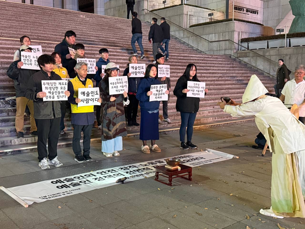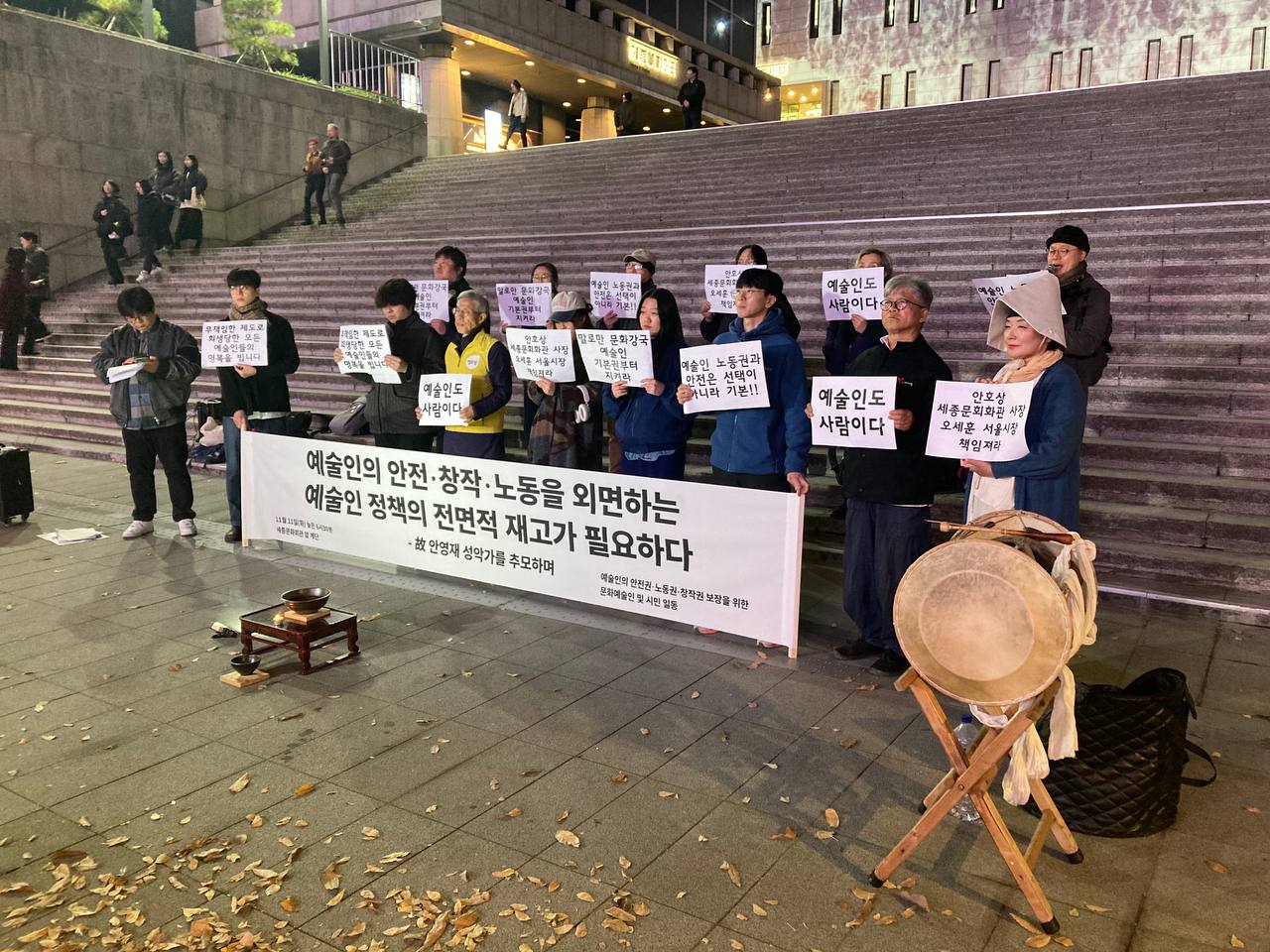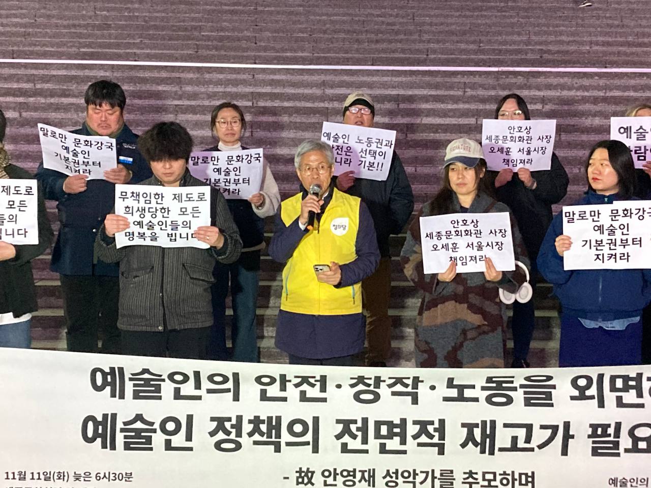 예술인의 죽음 앞에서, 책임을 외면하는 이들을 규탄합니다. 먼저, 오세훈 서울시장을 규탄합니다. 오세훈 시장의 임기 동안 서울의 문화정책과 예술정책은 무너져 내렸습니다. 예술인의 기본권리, 시민의 문화적 기본권은 외면한 채, 오세훈 서울시장은 오로지 ‘도시경쟁력’과 ‘관광 수익’을 위해 문화공간을 개발사업의 수단으로, 예술인을 도시브랜드의 장식물로 만들어버렸습니다. 세종문화회관은 시민의 공간이자 예술인의 터전이어야 합니다. 그러나 지금의 세종문화회관은 안전보다 흥행, 예술보다 효율을 앞세우는 관료적 구조로 변질되었습니다. 그 중심에는 블랙리스트 국가범죄의 주범이었던 안호상 사장이 있습니다. 예술인을 통제하고 배제하던 인물이, 다시 예술인을 죽음으로 내모는 자리에 앉아 있습니다. 이것이 바로 오세훈 서울시장이 만든 서울의 문화행정의 민낯입니다.