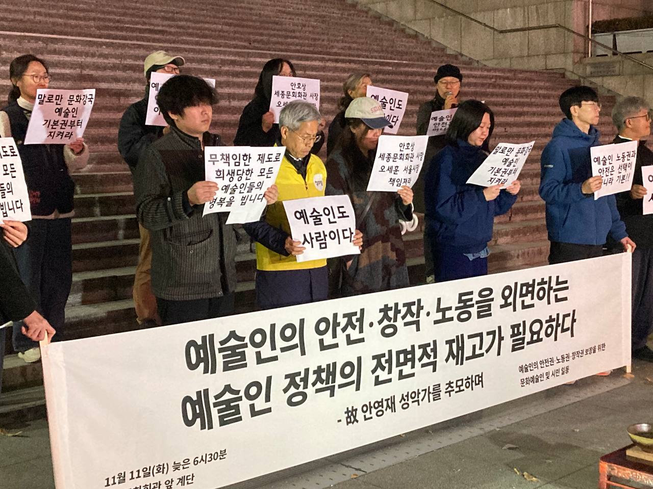 안영재님의 명복을 빕니다. 우리는 또 한 명의 예술노동자를 잃었습니다. 이 죽음 앞에서 침묵은 공범입니다. 오늘 저는 애도의 자리를 넘어, 책임을 묻고 바꾸자고 말하겠습니다.