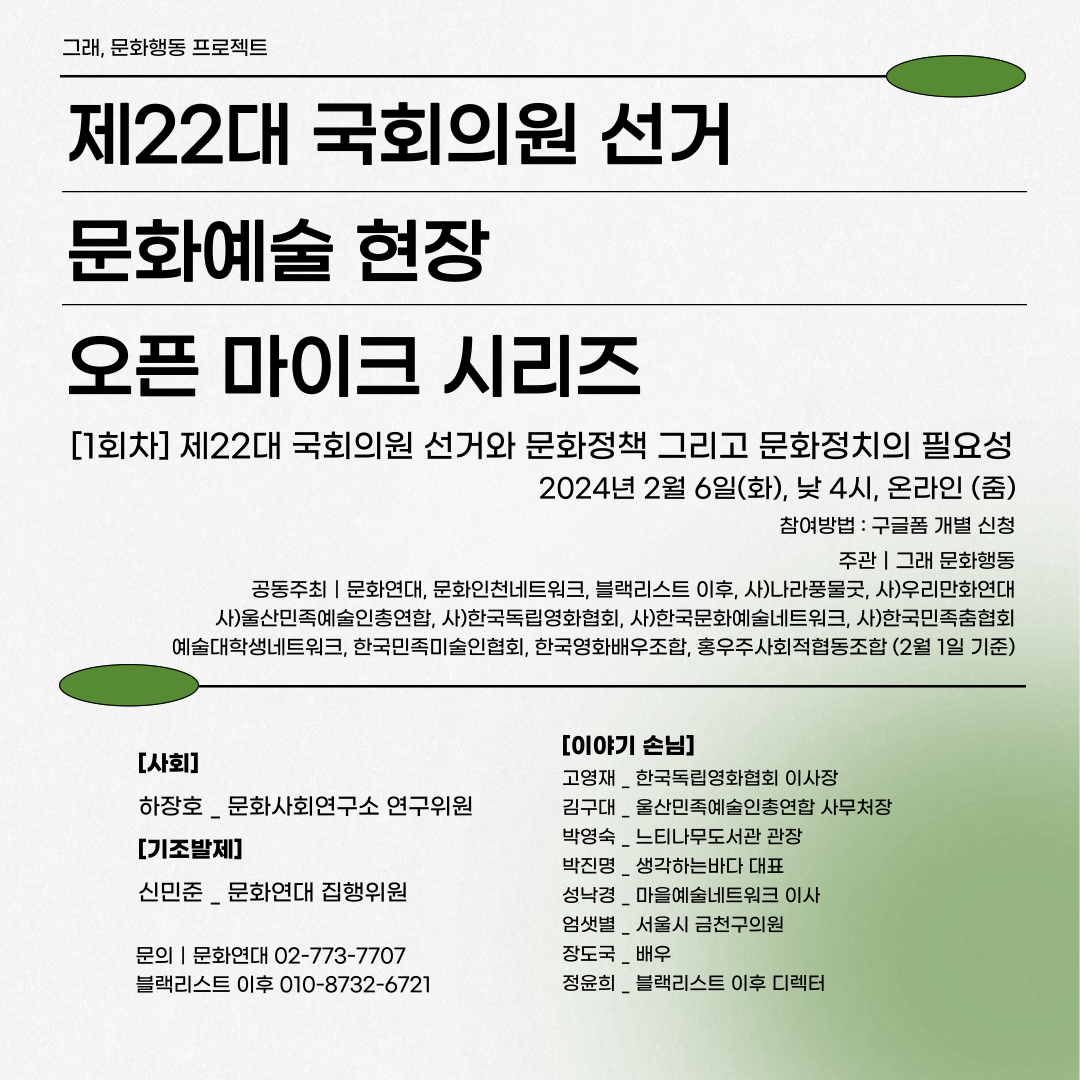 - 1회차 : 제22대 국회의원 선거와 문화정책 그리고 문화정치의 필요성_ 2월 6일(화) 낮 4시, 온라인(줌)