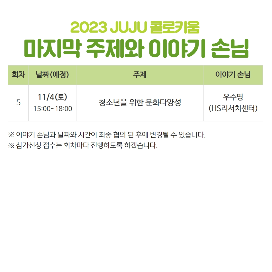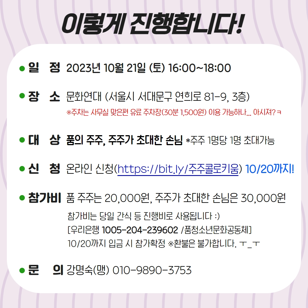 2023년 10월 21일(토) 16:00~18:00, 문화연대 사무실에서 진행되어요.