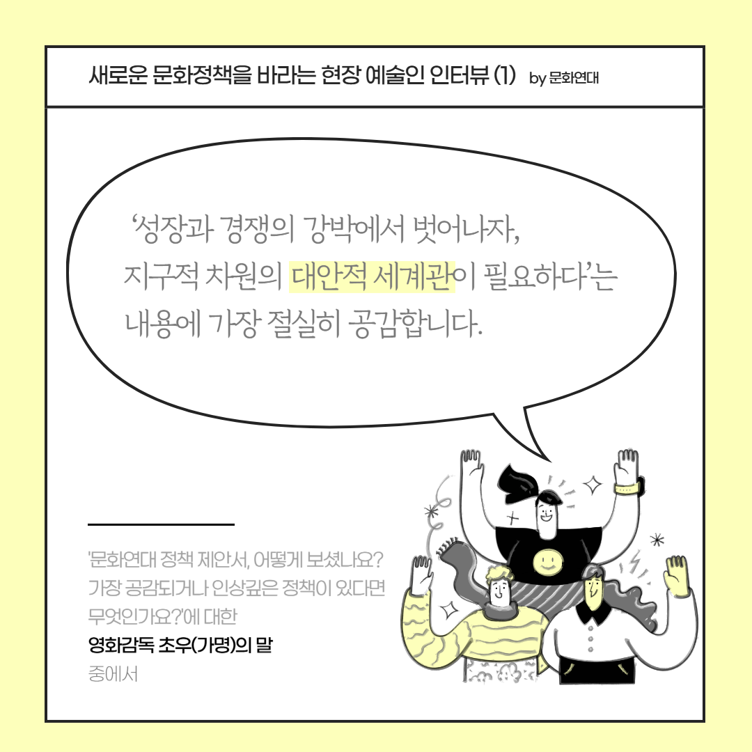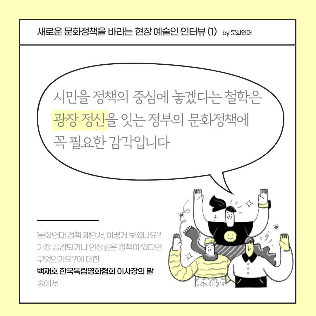문화연대의 정책 제안서는 문화행정의 개선을 넘어, 문화정책의 존재 이유를 담은 정책 제안서라고 생각합니다. 특히 ‘관료주의 문화행정의 전면 개혁’, ‘블랙리스트 특별법 제정’, ‘예술인을 위한 기본권 보장’ 등은 독립영화 진영에서도 오랫동안 외쳐온 목소리이기 때문에 공감이 되었습니다.