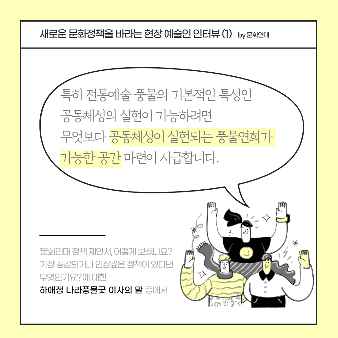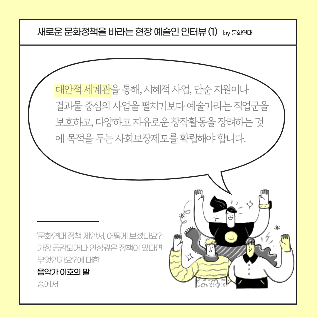 문화연대가 제안한 정책은 현 상황에서 더 필요한 것이 아니라 기본적으로 필요한 것이라 생각합니다. 전통예술 풍물을 전업으로 버는 연 1000만원 이내의 수입은 전업이나 폐업이 선택 사항이 아니라 곧 주어질 미래일 수도 있다는 불안을 제공합니다. 예술적 전업이 힘든 경제적 상황과 거의 전무한 노후 대책 등으로 전업의 지속성이 위협받는 현실을 살고 있는 대한민국 예술인의 한사람으로서 선거 국면에 가장 필요한 정책으로 와닿는 것은 ⑥,⑦입니다.