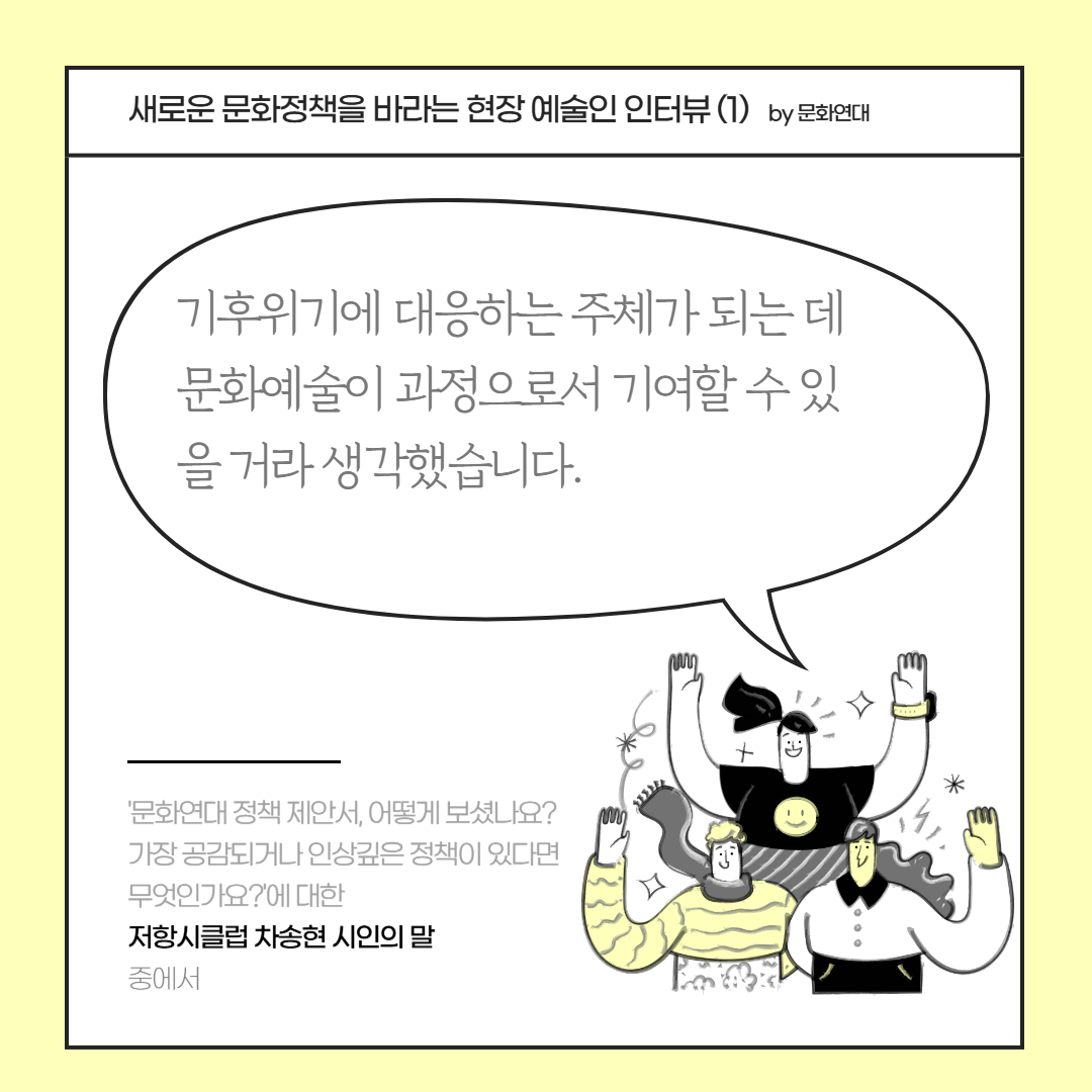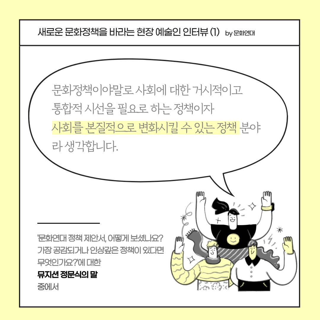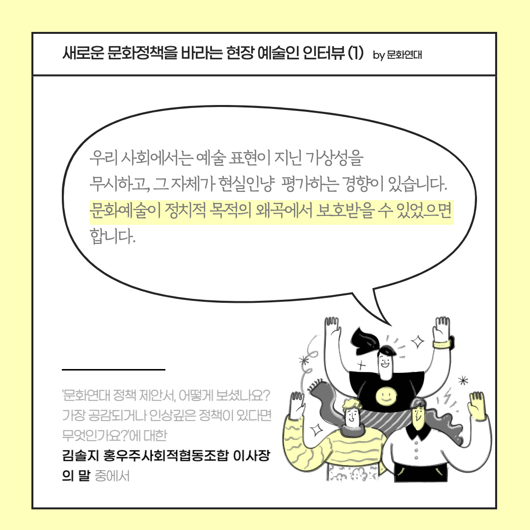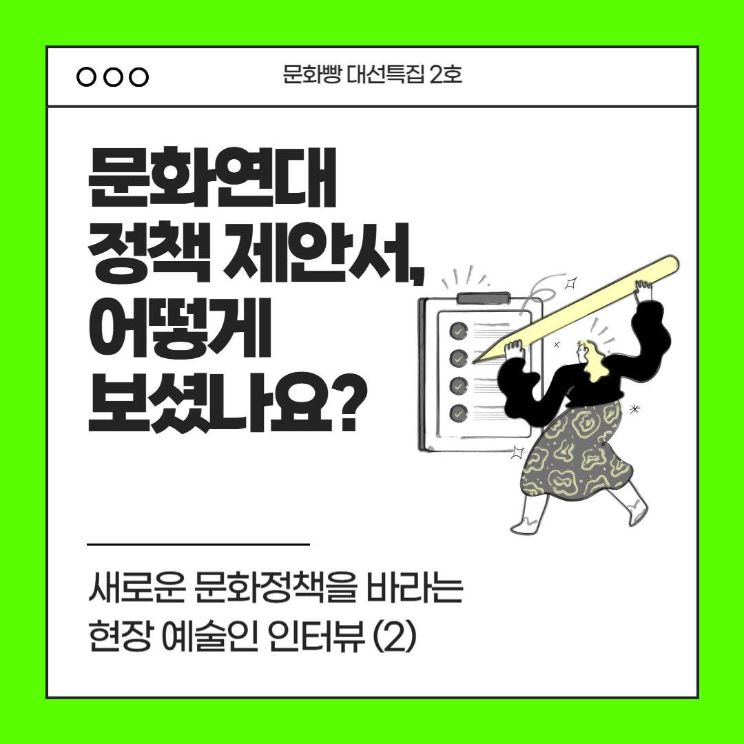 문화연대는 21대 대통령 선거를 앞두고 새로운 문화정책을 바라는 현장 예술인의 목소리를 담기 위해 서면 인터뷰를 진행하였습니다. 지난 4월 말 문화연대가 만든 문화연대 문화정책 제안서에 대한 의견을 비롯해, 문화운동의 과제 등 아래 네 가지 질문을 던졌습니다.
