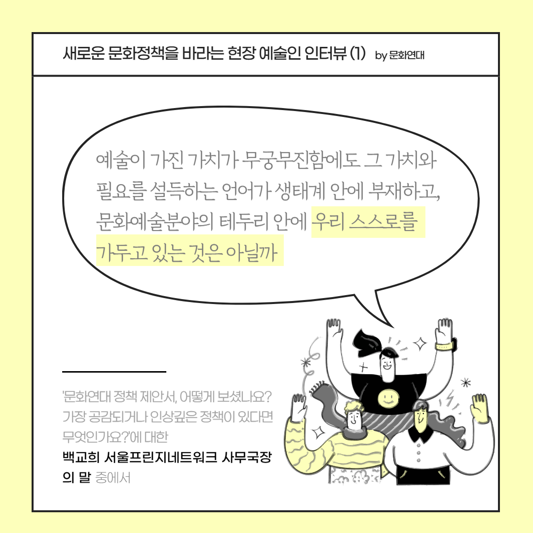 이번주와 다음주에 걸쳐 그 답변들을 공개합니다. 예술인들이 문화정책과 문화운동에 대해 어떤 생각을 갖고 있는지 함께 들여다볼까요?