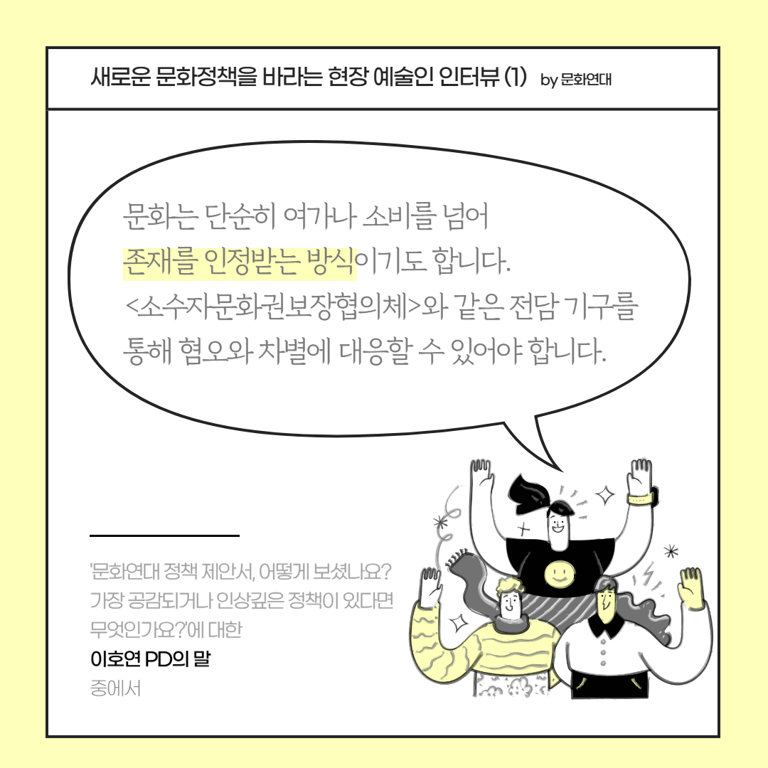 이러한 현실은 단편적 지원이나 일회성 제도로 해결될 수 없습니다. <소수자문화권보장협의체>와 같은 전담 기구를 통해 정기적이고 체계적인 실태 조사와 정책 수립뿐 아니라, 아트하우스 모모 사례와 같이 드러난 문제들에 대응하기 위해 문화시설 운영의 기준과 절차에 대한 제도적 보완, 혐오와 차별에 대응할 수 있는 행정적 대응 체계 마련 등 현장과 긴밀하게 연결되어 구체적인 실행력을 갖춘 정책 설계가 뒷받침되어야 합니다. 해당 정책은 구체적이고 실질적이며 창작자의 표현의 자유와 이를 관람하고 사유할 수 있는 향유자의 권리를 박탈하지 않는 문화 환경을 만들어갈 수 있는 정책입니다.