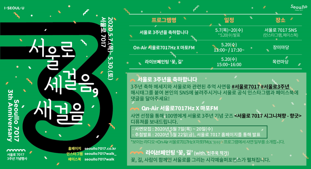 서울 중심에서 꽃과 나무를 즐기며 걸을 수 있는, ‘서울로 7017’의 3주년 이벤트에 많은 관심과 참여 부탁드립니다.
