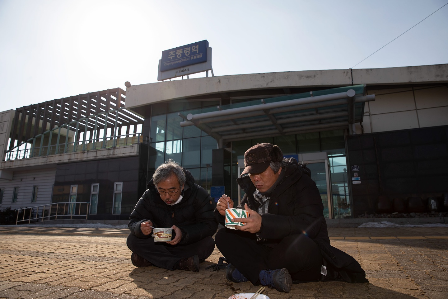 머리부터 발끝까지 싸매고 마스크까지 하고 가니 서로를 몰라보다가 반갑게 인사를 한 뒤에 오전 11시에 김천시 봉산면 신암리에서 출발한 행진은 한 시간 뒤에는 추풍령을 넘었습니다. 그리고 추풍령역에 이르니 ‘십시일반 음식연대’의 밥차가 와 있었습니다. 역전 마당 길바닥에 퍼질러 앉아서 먹었던 황태국밥은 환상적이었지요. 코로나 방역을 위해서 옹기종기 둘러앉지는 못하고 드문드문 앉아서 먹기는 했지만, 배고팠던 때라서인지 어떤 맛집의 음식보다도 더 맛있었습니다.