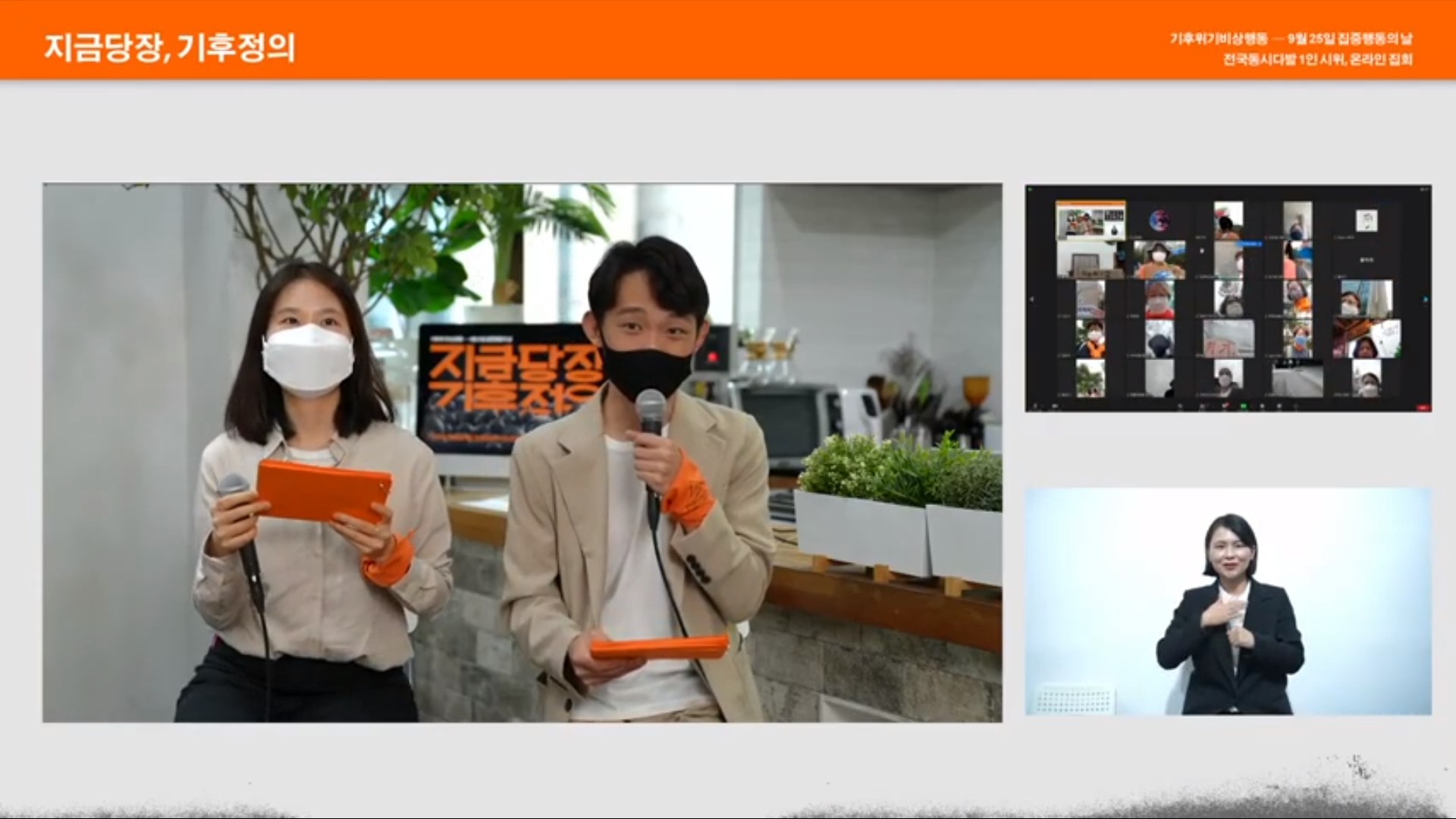 온라인 집회는 부문별 발언을 단순히 펼쳐놓기보다, 각 부문이 서로 대화를 하며 '기후정의'라는 단어를 중심으로 교차할 수 있도록 기획하였습니다. 청년, 청소년, 노동, 핵에너지, 시니어, 여성, 농업, 보건의료 분야에서 활동하는 사람들의 목소리와 더불어, 현장에서 1인시위를 진행하고 있는 다양한 지역의 시민들의 목소리를 들었습니다.