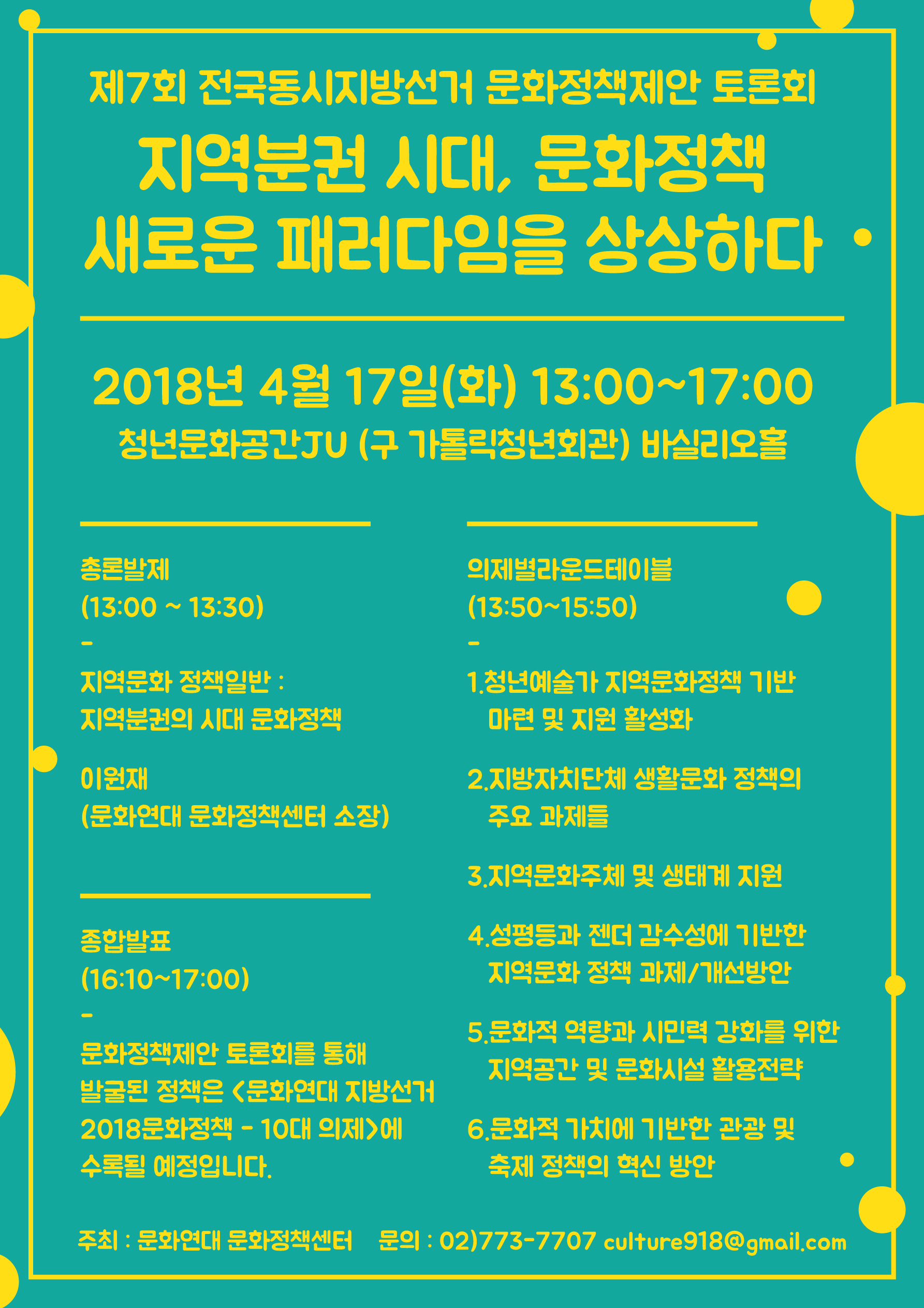 오는 4월 17일 화요일 13시부터 청년문화공간JU(구 가톨릭 청년회관)에서는 문화연대 문화정책센터 주최로 ‘<제7회 전국동시 지방선거 문화정책제안 토론회> -지역분권 시대, 문화정책의 새로운 패러다임을 상상하다.’라는 공개 토론회를 개최합니다.