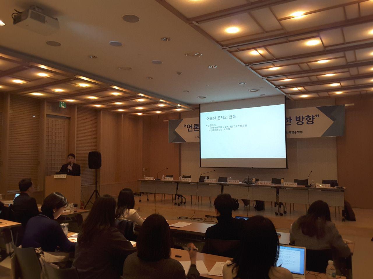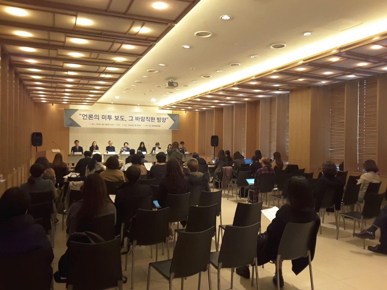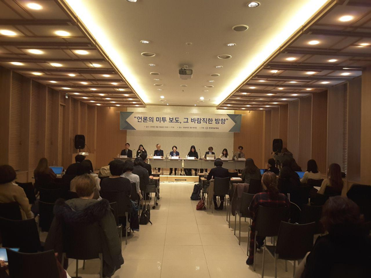 이와 같은 상황들에 발맞추어, 지난 3/23(금) 한국방송회관에서는 한국방송학회 주최로 ‘언론의 미투 보도, 그 바람직한 방향’이라는 세미나가 진행됐다. 언론이 사건을 보도하고 공유하는 중추적 역할을 자임하고 있는 상황에서 ‘인권 침해 및 2차 피해의 우려와 선정성만 주목받을 가능성이 있는 성폭력 폭로 보도에 대해 언론은 어떤 자세를 취해야 하는가?’, ‘언론의 역할은 무엇인가?’, ‘언론의 역할 수행은 잘 이루어지고 있는가?’ 등의 질문을 던지며 세미나가 시작되었다. (좌장에는 한림대 교수 김경희, 기조발제에는 성균관대 교수 이재국, 패널에는 조선대 교수 이희은, 서울여대 교수 박진규, 민주언론시민연합 사무처장 김언경, 한국여성민우회 미디어운동본부 사무국장 정슬아, 미디어오늘 기자 정민경, 한겨레21 기자 송채경화가 세미나에 참여했다.)