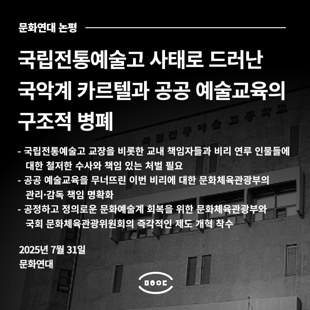 또한 이번 사건은 단순한 채용·입시 비리를 넘어, 이른바 ‘국악계 카르텔’의 존재 가능성을 적극적으로 드러낸다. 특정 교사 라인과 학교 내부 인맥, 외부 레슨 네트워크 등 이익을 공유하는 폐쇄적 집단이 비공식적으로 영향력을 행사하고 있다는 증언은 예술교육 전반에 경종을 울린다. 문화예술계 전반에서 오랫동안 문제로 지적되어온 폐쇄성과 내부 기득권 유지 구조가 이번 사건에서도 그대로 반복되고 있다는 점에서, 이 문제는 단지 한 학교에 국한된 것이 아니다. 전통예술 교육의 공공성과 투명성을 회복하기 위해서는 이러한 구조적 카르텔을 해체할 대책이 필요하다. 국악계 내부에서부터 자성의 움직임을 보여야 한다.