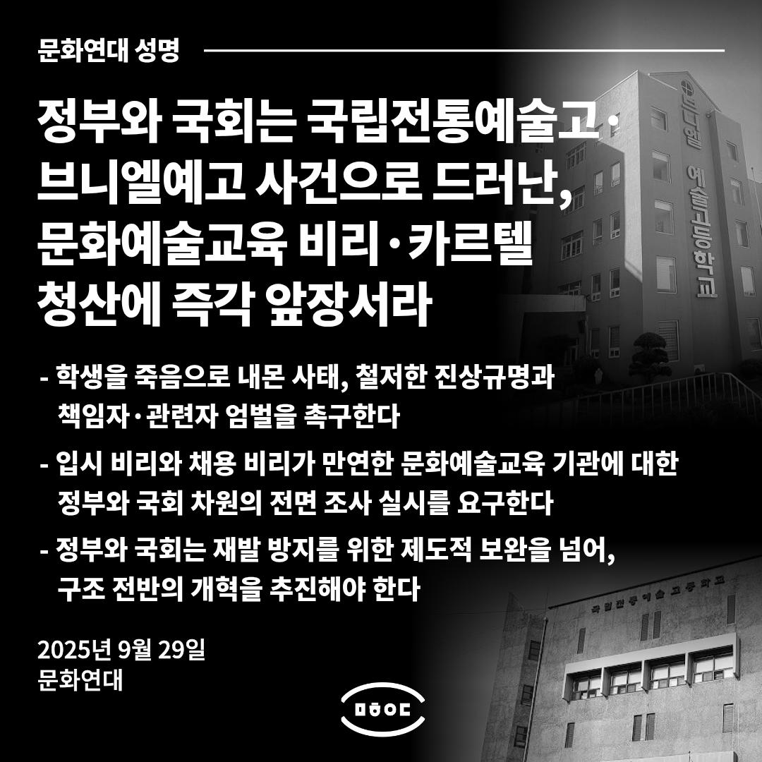 문화연대는 정부와 국회 그리고 수사당국에 강력히 촉구한다. 국립전통예술고와 브니엘예고 사건의 전모를 낱낱이 밝히고, 책임자와 관련자를 단호하게 처벌해야 한다. 더 나아가 문화예술교육 전반에 대한 국가 차원의 전면 조사가 필요하다. 학생들의 권리와 미래를 지키기 위해서는 단발적 처벌을 넘어 구조 개혁이 필수적이다.