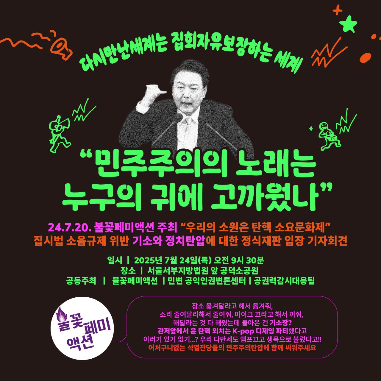 허나 불법 비상계엄이 터지기 직전인 2024년 11월 29일, 검찰은 해당 소요문화제의 집회 신고자를 소음규제 위반으로 서울서부지방법원에 약식기소(벌금형)하였다. 이에 국가의 억압에 이전과 동일하게, 앞으로도 똑같이 저항하고자 한다. 이 기소는 시민의 민주적인 항의와 표현의 자유를 제도적으로 억압하고, 국민의 권력을 빌려 대리인으로서 공직에 선출된 이에 대한 권력 비판을 형사처벌로 막으려는 시도이다.