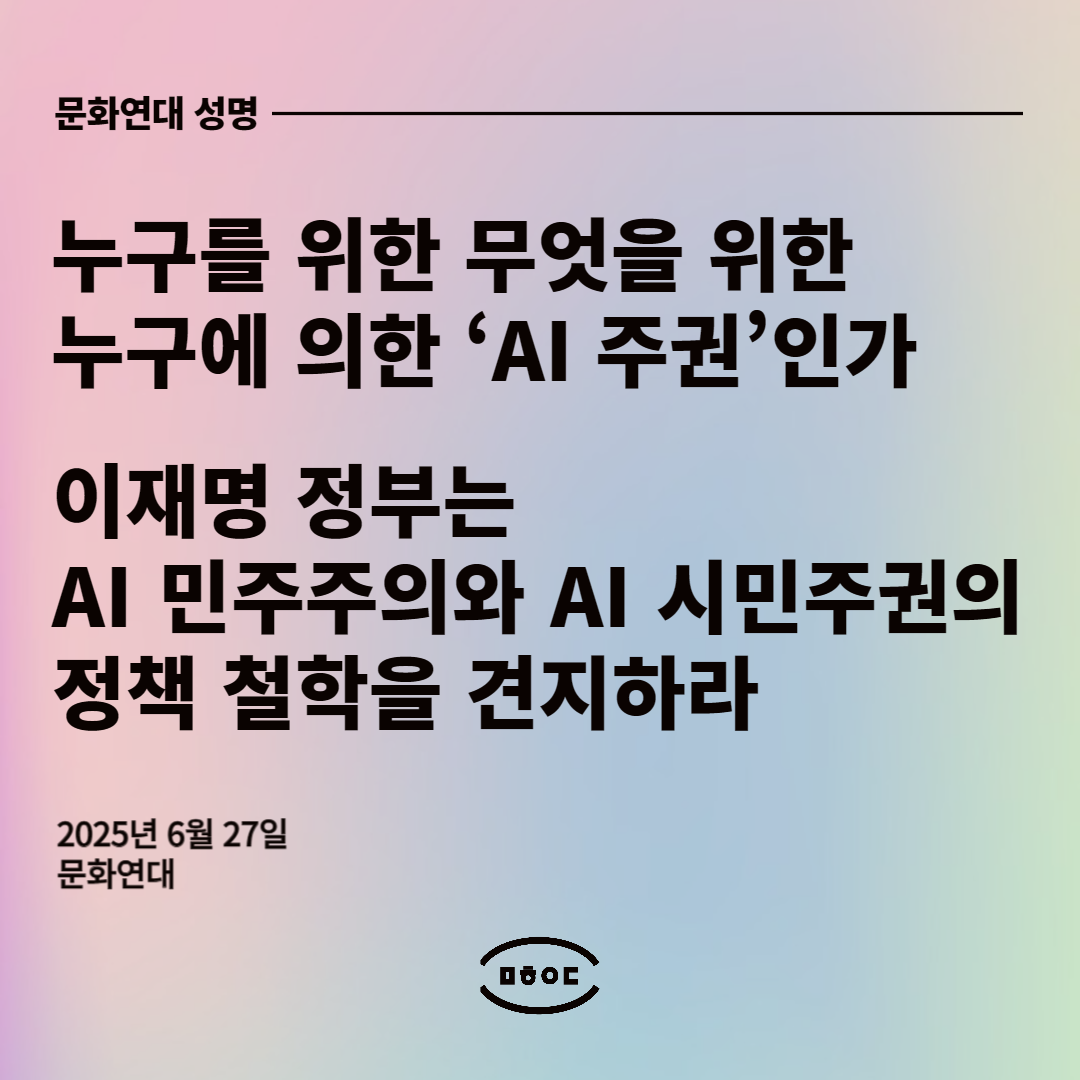 이재명 대통령은 “AI기본사회”의 기조를 국가주의적 전략과 산업진흥정책으로만 채울 것이 아니라, 민주사회의 기본 질서와 시민권리에 입각해 세워야 한다. 지난 문화연대 성명서 [우리의 인공지능은 정녕 민주주의와 멀어지려는가](2025. 05. 29.)에서 표명했듯이, 과학기술은 전문가만의 전유물이 아니며 전체 민주사회와 긴밀한 관계 속에서만 진정한 성과를 달성할 수 있다. AI 역시 해당 사회문화 정책의 입안부터 집행과 관리에 이르기까지 시민사회와의 폭넓은 숙의와 검증을 거쳐야만 한다. AI과학기술과 사회 속 민주주의의 균형 발전이야말로 AI기본사회의 기조가 되어야한다.