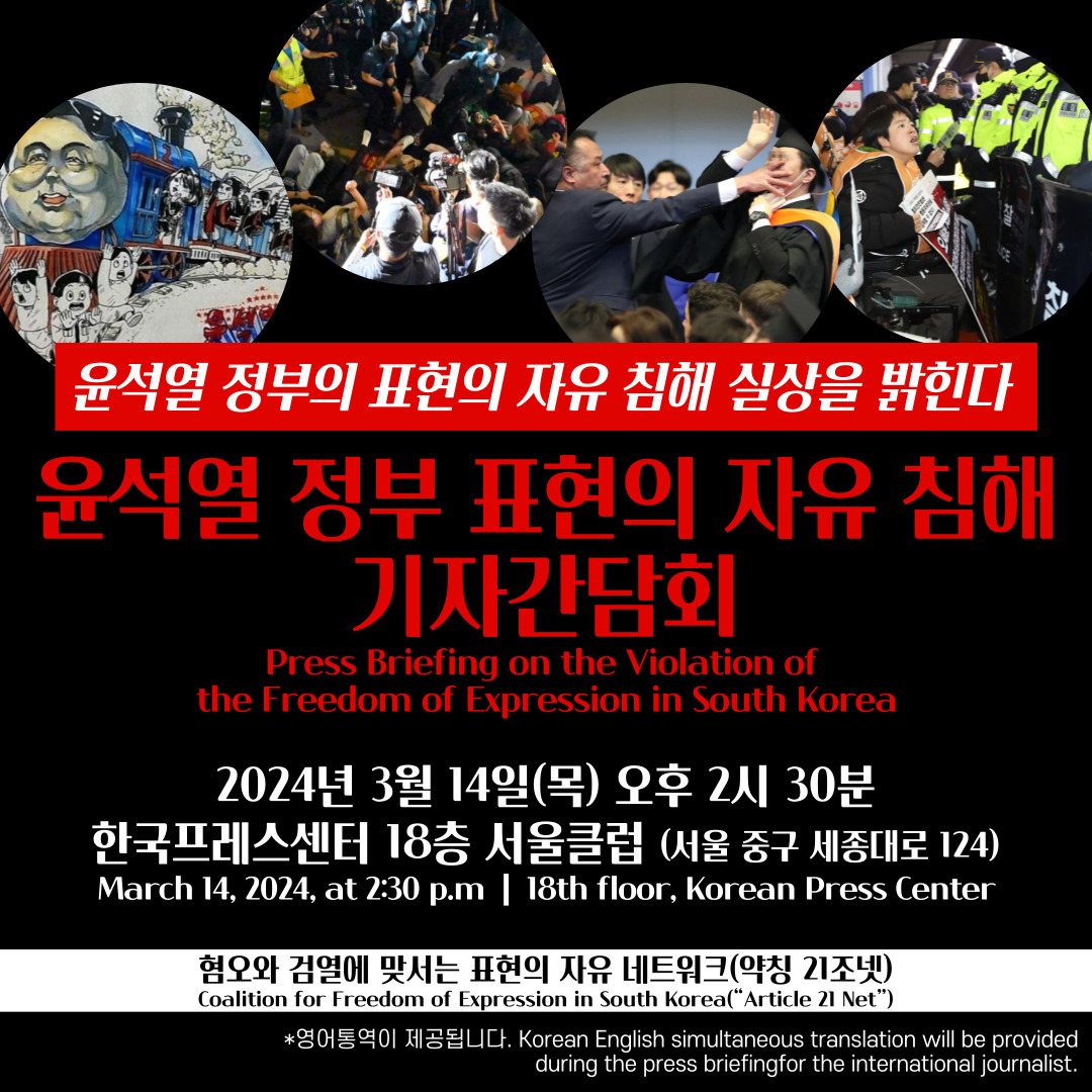 The civil society organizations and media groups in South Korea build the “Coalition for Freedom of Expression in South Korea ("Article 21 Net") and will be convening a press briefing to examine the diminishing freedom of expression in South Korea. This event is scheduled for March 14th at 2:30 PM at the Seoul Foreign Correspondents’ Club, Korea Press Center.