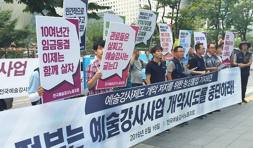 지난 해 8월, 예술강사들이 문화예술교육진흥원 앞에서 농성을 한 것은 문체부가 예술강사들의 학교선택권을 제한하려 했기 때문이다. 그 동안은 예술강사들이 학교를 선택해왔는데, 갑자기 문체부가 학교 교사들이 강사를 선택하는 방식으로 ‘예술강사 배치제도’를 시행하려 한 것이다. 예술강사들이 거세게 반발하자 그 계획은 결국 철회되었다. 그런데 이번에 또 문체부가 예술강사 운영방식을 바꾸겠다고 나서고 있다. 2017년부터 예술강사에 대해 매년 재시험·재심사를 실시해 합격한 경우에만 재고용하고, ‘반복참여’를 제한하겠다는 그것이다. 전국예술강사노조가 있음에도 불구하고 이번에도 아무런 사전협의 없는, 문체부의 일방적이고 독단적인 결정이었다.